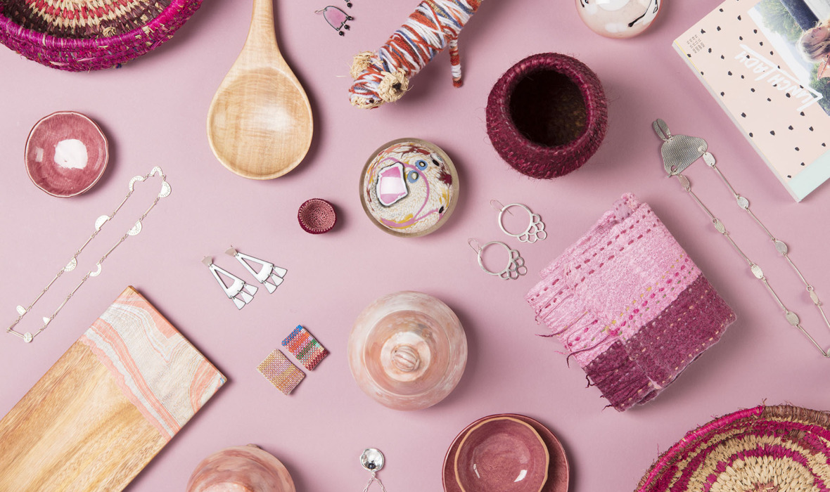 Wooden pears by Roger Pike, speckle range by Stewart Scambler, wooden bowl by Roger Symons, soaps by Thurlby Herb Farm, wooden dishes by Tony Docherty and gumnut strings by Papulankutja Artists